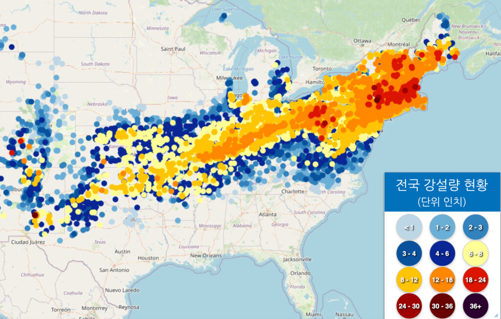 ▲ 뉴저지 (NJ): 최대 적설량 17인치. 북부 뉴저지 지역에 최대 17인치(43cm)의 눈이 내렸다. 럿더퍼드 등에서는 주택들이 눈에 파묻혔으며, 체감 온도는 화씨 -20도(-29°C)까지 떨어졌다. 수천 가구에서 정전이 발생했고, NJ TRANSIT은 부분 운행에 들어갔다.