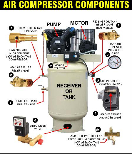 Last month I discussed the essential components of a reciprocating compressor; motor, pump, and receiver (tank), which you’ll find on every machine in this family of compressor. This month I’ll be explaining the function of other components that, when combined, make up a complete air compressor. In review, the electric motor is connected to the