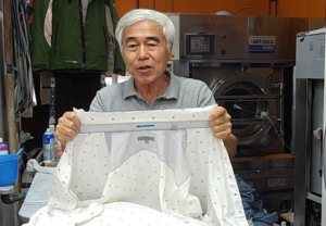 Mr. Sohn, a 100% wetcleaner explains how he cleans ground-in grime on the pant hems.